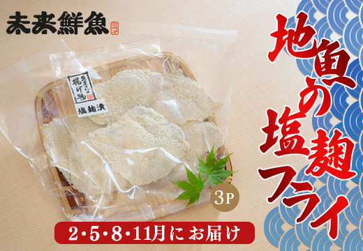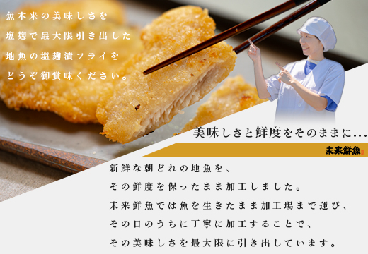 朝獲れの新鮮な魚をすぐに加工し、塩麹に漬け、衣をつけた塩麹フライを3ヶ月に一度、計4回お届けします。