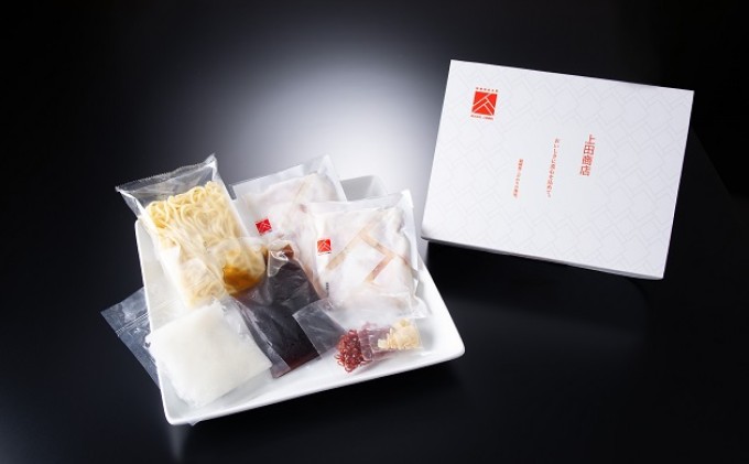 【上田商店】スープ(醤油味)250g×1pc、国産牛小腸100g×2pc、ちゃんぽん麺200g×1pc、コラーゲン50g×1pc、にんにくライス3g×1pc、赤唐辛子2g×1pc