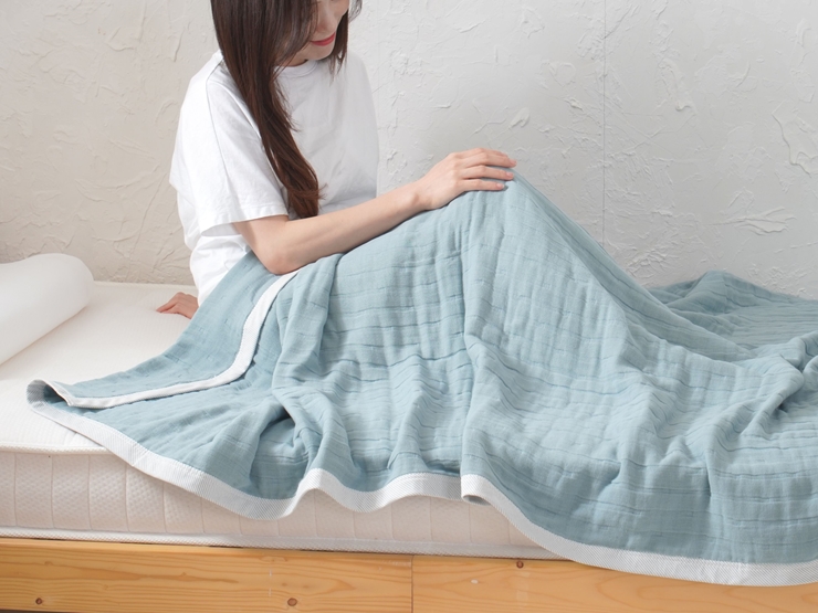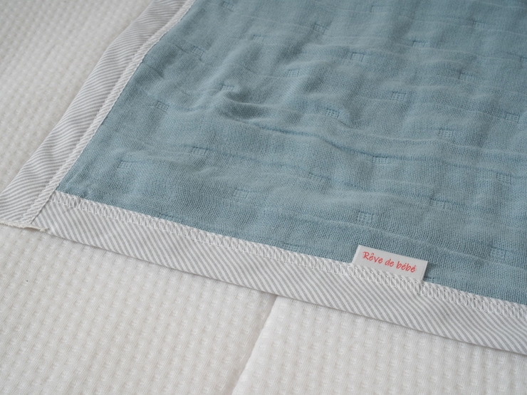 肌に触れる両表面のガーゼは肌着と同様のガーゼ生地を使用し、内側6層のガーゼは密度を下げる事で空気を含みやすくし、適度な厚みがあり、ふんわりした肌触りよい商品です。