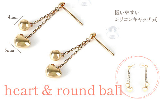 華やかな印象を与えてくれるイエローゴールドの地金を使用した長さ違いのチェーンに、シンプルな丸玉と可愛らしいハートの形を組み合わせた華奢で女性らしいピアスです。