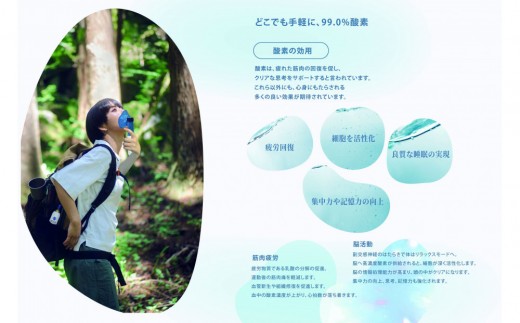 簡単操作で手軽に酸素補給できるので、スポーツや登山の疲労回復はもちろん、勉強や仕事に集中したい時、リラックスしたい時等様々なシーンで幅広くお使いいただけます。