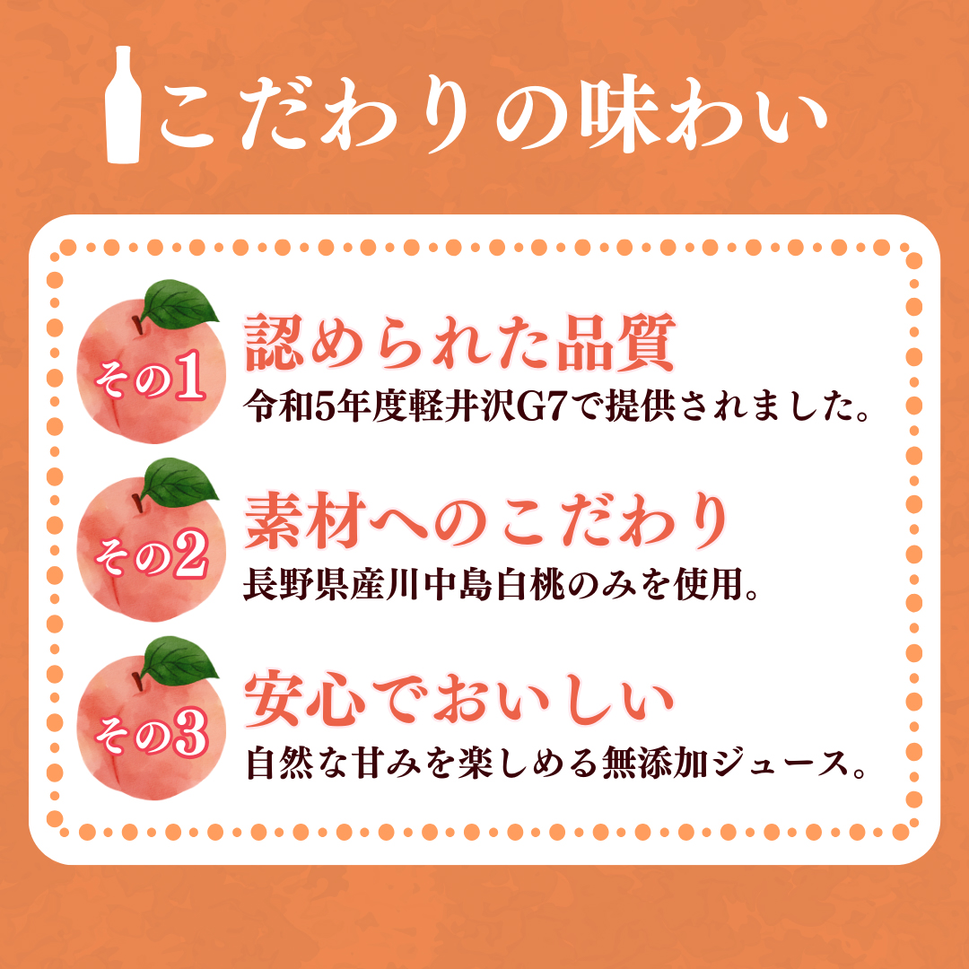 信州善光寺平を流れる千曲川の恵みをうけ、甘みを充分に蓄えた川中島白桃をそのまま搾った果汁100%ストレートジュースです。