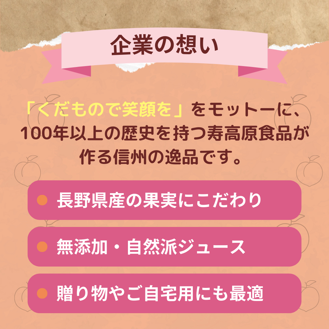 壽高原食品は、長野県・旧更級村に前身となる会社を設立以来100年、安心・安全を胸に、果物とともに歩みを進めてまいりました。地域の特産品であるあんずを使ったジャムに始まり、日本初のりんご汁(りんごジュース)、りんごの無添加搾汁など、常に時代を先駆ける商品開発を行ってきました。現状に甘んじることなく、常に挑戦し続ける企業を目指し、これまで育んできた「果実と向き合う真摯な姿勢」を大切に、そして「安心安全なモノづくり」を胸にこれからも多くの皆様に愛され信頼されるよう事業展開をして参ります。