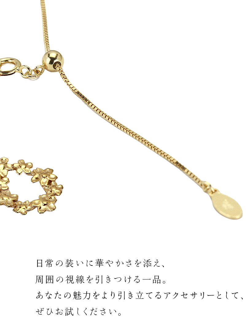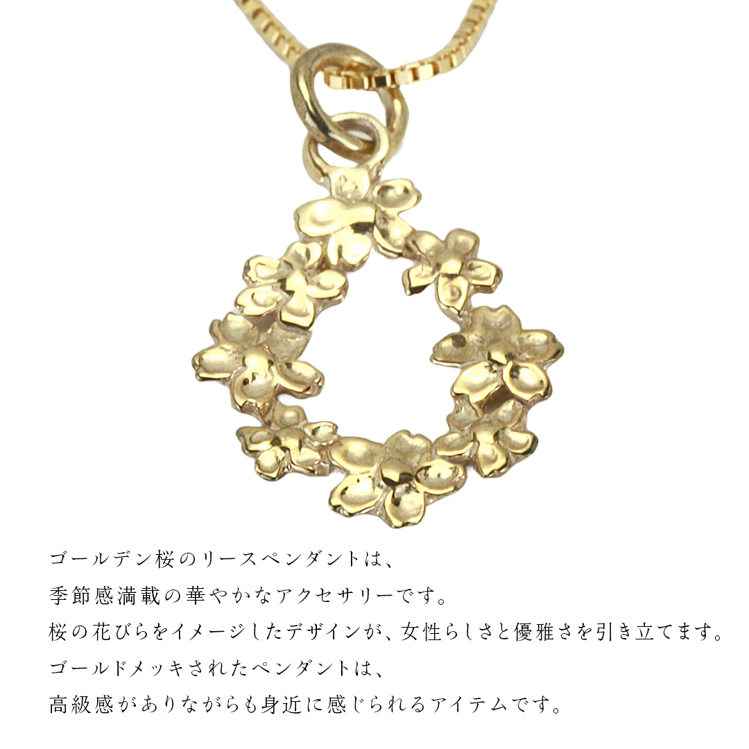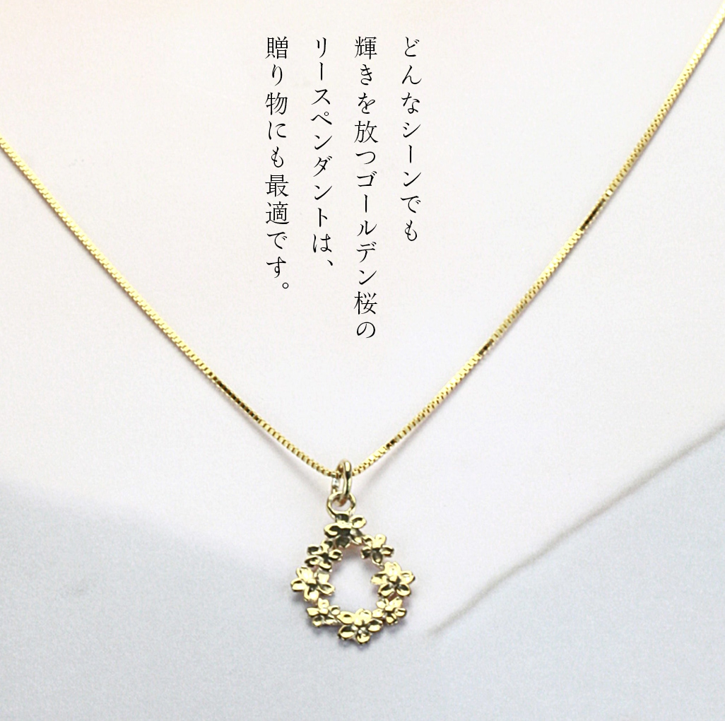 どんなシーンでも輝きを放つゴールデン桜のリースペンダントは、贈り物にも最適です。