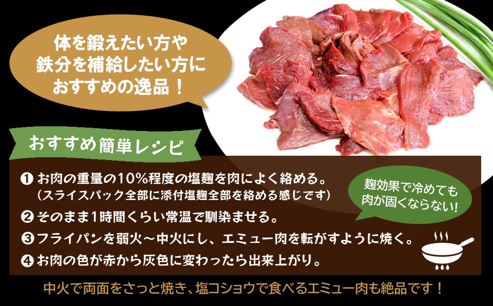 麹効果で冷めても肉が固くならず、エミュー肉の味と麹の焼けた香りが何とも言えない風味です。