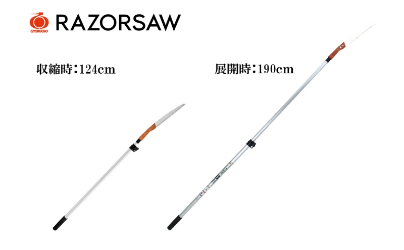レザーソーの高枝切のこぎりは短くすると1.2mほどになり、刃をとると90cmとさらに短くなります。