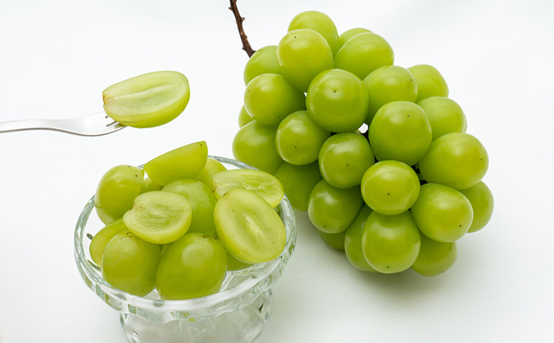 シャインマスカットは、上品な香り、奥行きのある甘さ、瑞々しい果汁が特徴のいわずと知れた高級ぶどう。降水量が少なく“晴れの国”と呼ばれる岡山県で作られる、最高級のシャインマスカットが『晴王(はれおう)』です。晴王は大粒で種がなく、甘みが強く、皮ごと食べられるのが特徴です。一口噛むとパリッと音をたてて果汁が弾け、弾力のある食感を楽しみつつ、甘さが口いっぱいに広がる、大変質の高いぶどうです。
