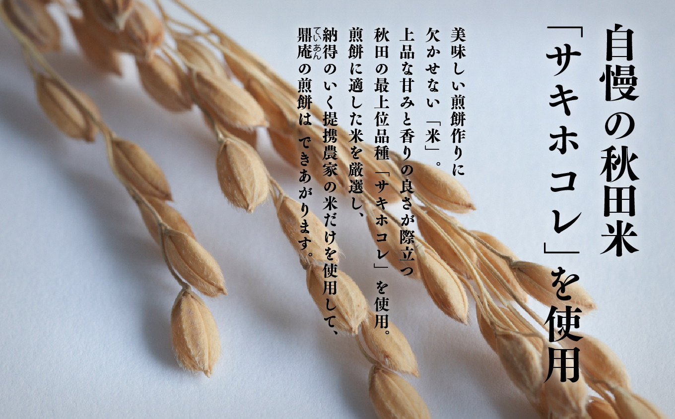 うるち米(秋田県産サキホコレ)、甘エビ(秋田県産)、米菓用調味液(しょうゆ、砂糖、たん白加水分解物、水あめ、酵母エキス)/調味料(アミノ酸等)、増粘剤(加工でん粉)、(一部に小麦・えび・大豆を含む
