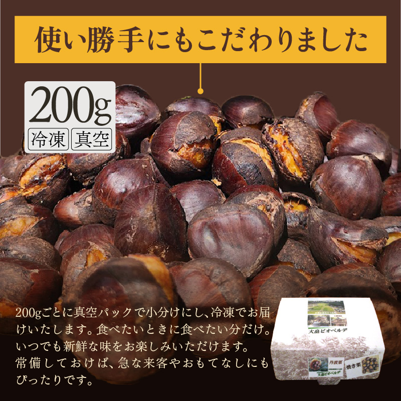 栽培期間中は農薬を一切使用せず、Lサイズ以上の大粒な丹波栗のみを厳選しています。最大のこだわりは、低温でじっくり熟成させることで栗本来の糖度を極限まで高めている点。これにより、まるでスイーツのような濃厚な甘みが生まれます。焼き上げることで表面は香ばしく、中はしっとりとした食感に。使いやすさも追求し、200gずつの真空パックで冷凍保存。いつでも手軽に本格的な焼き栗を楽しめるよう工夫しました。