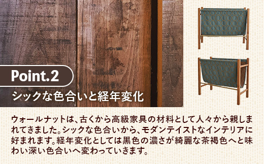 木部フレームは正式名称をアメリカン・ブラックウォールナットと呼び、濃い紫から黒色の特有の色合いが人気で、古くから高級家具や楽器の材料として親しまれてきました。