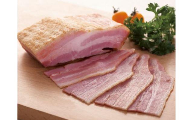 ロースハムに続く人気商品のベーコンは豚バラのまろやかさとスモークの香りが溶け合い、