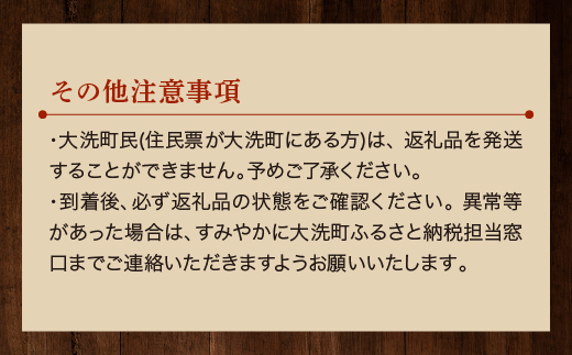 ・返礼品到着後、必ず返礼品の状態をご確認ください。異常等があった場合は、すみやかに大洗町ふるさと納税担当窓口までご連絡いただきますようお願いいたします。