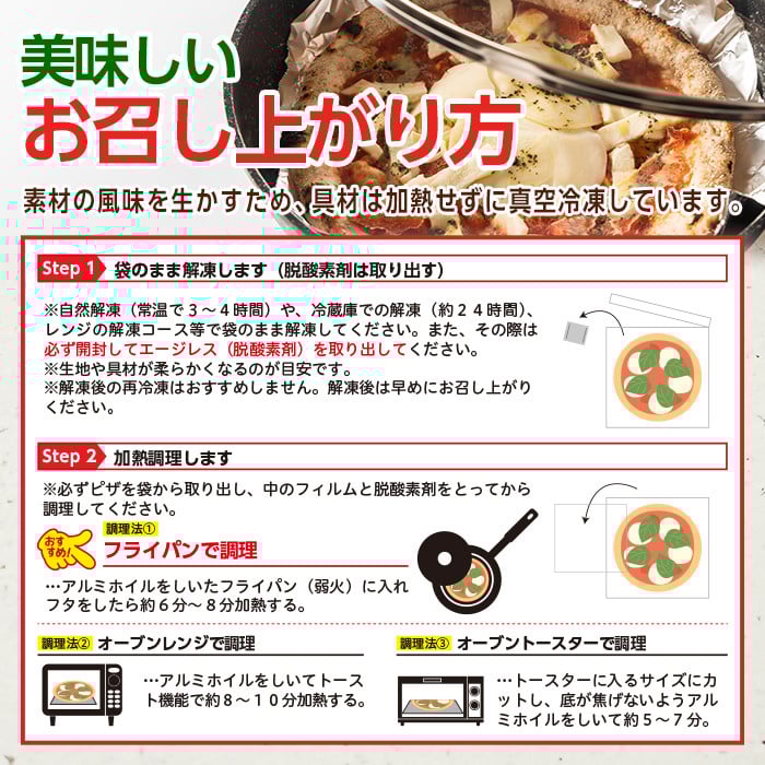 生地(国産)【小麦粉(イタリア産)、食塩、天然酵母】、トマトソース(国産)【トマトピューレー(イタリア産)、食塩、香辛料】、ナチュラルチーズ(アメリカ産)、オリーブオイル(スペイン産)、バジル(スペイン産)、その他 ※ 一部に小麦、乳成分、卵、大豆を含む