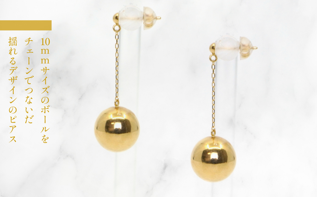 18金の10mmサイズのボールをチェーンでつないだ揺れるデザインのピアスです。