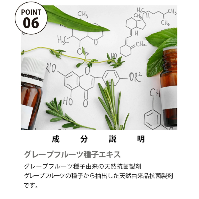 品質成分:水、プロピレングリコール、塩化ベンザルコニウム、グレープフルーツ種子エキス
