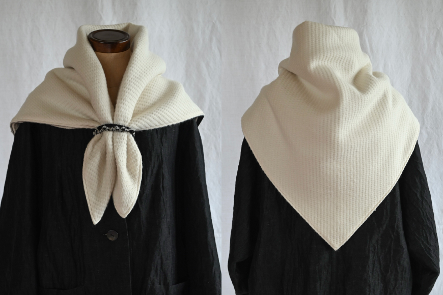 二重織地(黒×生成り)のはぎれを継ぎ接いだ部分とオーガニックコットンの布地を組み合わせた大判のストール。