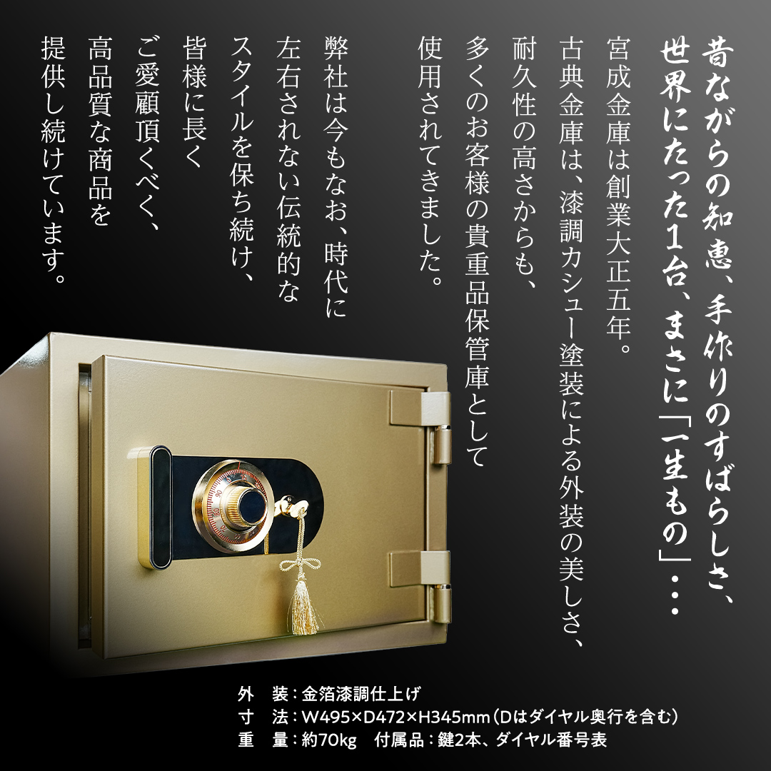 宮成金庫は創業大正五年。古典金庫は、漆調カシュー塗装による外装の美しさ、耐久性の高さからも、多くのお客様の貴重品保管庫として使用されてきました。