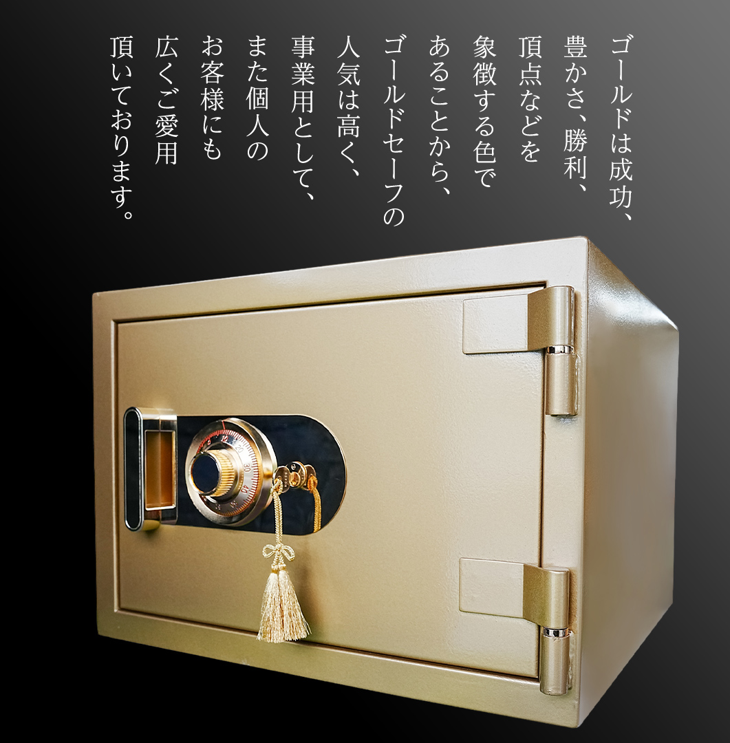 ゴールドは成功、豊かさ、勝利、頂点などを象徴する色であることから、ゴールドセーフの人気は高く、事業用として、また個人のお客様にも広くご愛用頂いております。