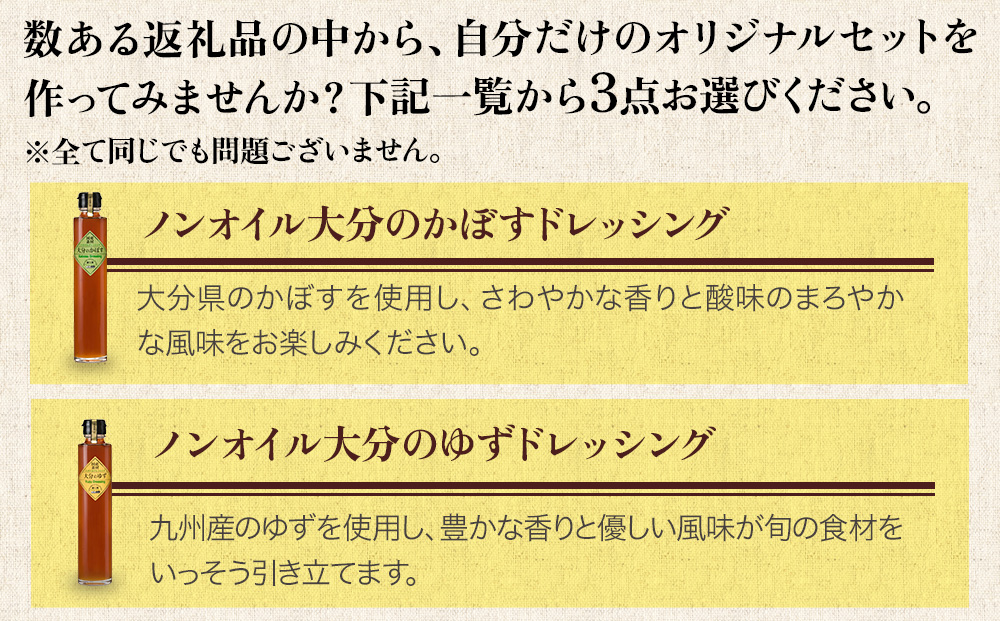 ・ノンオイル大分のかぼすドレッシング:糖類(砂糖混合ぶどう糖果糖液糖、水飴)、こいくち醤油、かぼす果汁、たんぱく加水分解物、米発酵調味料、醸造酢、食塩、魚醤、魚介抽出液、(さば、にぼし)、かつおぶし抽出液、かつおエキス、こんぶエキス、赤唐辛子/増粘剤(加工でんぷん)、調味料(アミノ酸等)