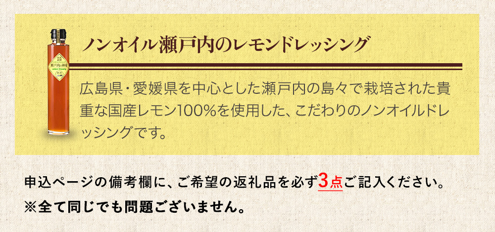 広島県・愛媛県を中心とした瀬戸内の島々で栽培された貴重な国産レモン100%を使用した、こだわりのノンオイルドレッシングです。
