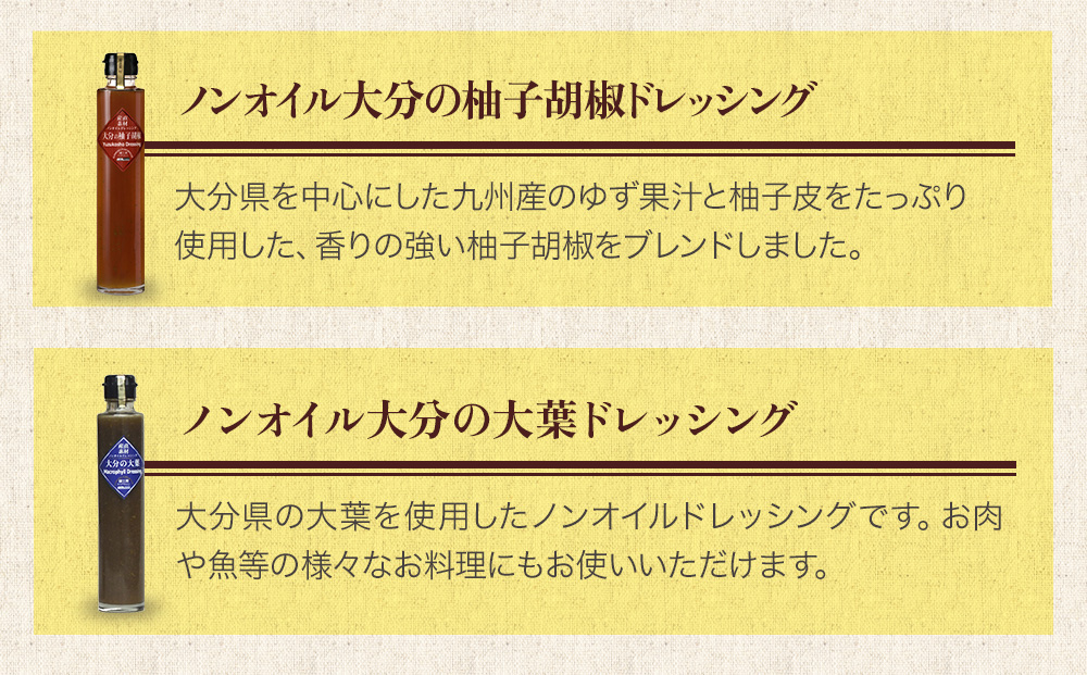 ・ノンオイル大分のゆずドレッシング:糖類(砂糖混合ぶどう糖果糖液糖、水飴)、こいくち醤油、たんぱく加水分解物、米発酵調味料、醸造酢、ゆず果汁、食塩、魚醤、魚介抽出液(さば、にぼし)、かつおぶし抽出液、かつおエキス、こんぶエキス、赤唐辛子/増粘剤(加工でんぷん)、調味料(アミノ酸等)