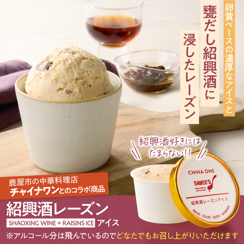 甕だし紹興酒にレーズンを浸して紹興酒の香りを移し、卵黄ベースの濃厚なアイスと混ぜ合わせています。