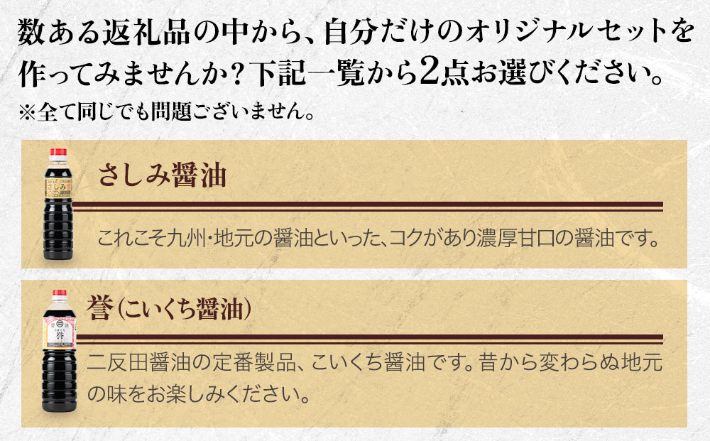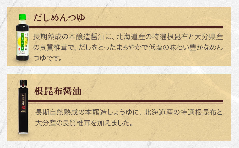 長期自然熟成の本醸造しょうゆに、北海道産の特選根昆布と大分産の良質椎茸を加えました。