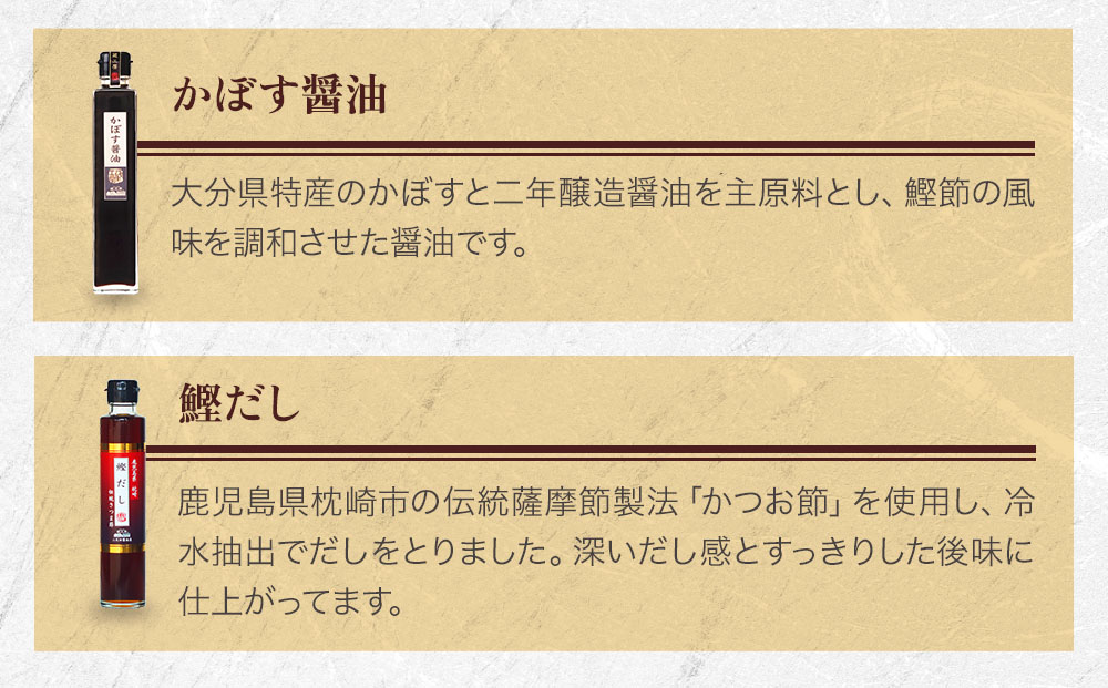 大分県特産のかぼすと二年醸造醤油を主原料とし、鰹節の風味を調和させた醤油です。