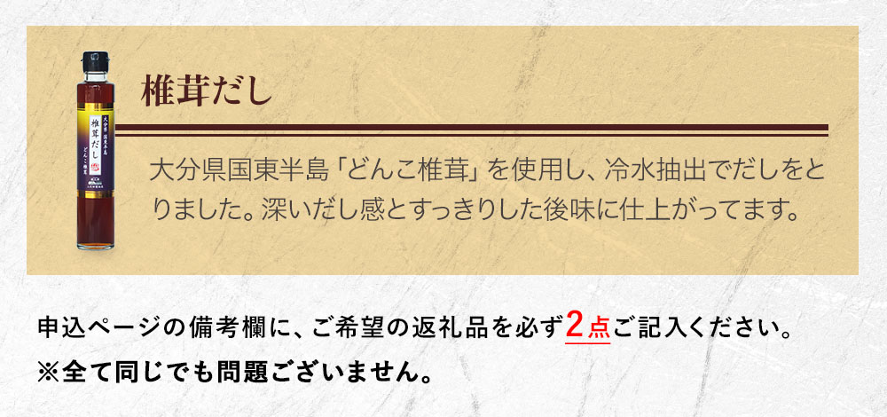 大分県国東半島「どんこ椎茸」を使用し、冷水抽出でだしをとりました。深いだし感とすっきりした後味に仕上がってます。