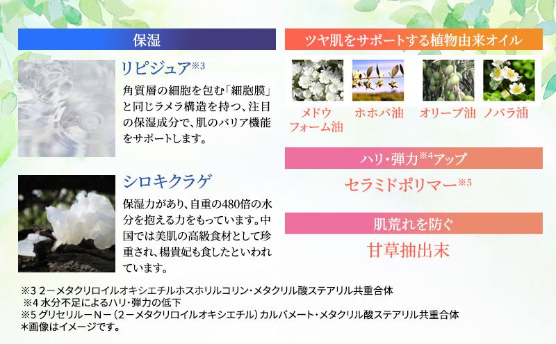 【その他成分】シロキクラゲ多糖体、ヒアルロン酸Na-2、ホホバ油、オリブ油、メドウフォーム油、ノバラ油、甘草抽出末、濃グリセリン、サラシミツロウ、ワセリン、グリセリル-N-(2-メタクリロイルオキシエチル)カルバメート・メタクリル酸ステアリル共重合体、2-メタクリロイルオキシエチルホスホリルコリン・メタクリル酸ステアリル共重合体、水、トレハロース、マルチトール、グリコシルトレハロース・水添デンプン分解物混合溶液、BG、DPG、ジメチコン、N-ラウロイル-L-グルタミン酸ジ(フィトステリル・ベヘニル・2-オクチルドデシル)、N-ラウロイル-L-グルタミン酸ジ(フィトステリル・2-オクチルドデシル)、トリオクタン酸グリセリル、オクタン酸セチル、ベタイン、トリグルコ多糖、ステアリン酸ポリグリセリル、イソステアリン酸ポリグリセリル、ステアリン酸ソルビタン、SEステアリン酸グリセリル、軽質流動イソパラフィン、ポリグリセリン、ステアロイルメチルタウリンNa、硬化油、POE(7)ラウリルエーテル、ベヘニルアルコール、粘度調整剤、pH調整剤、メチルパラベン、プロピルパラベン、ブチルパラベン