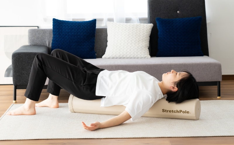 ストレッチポールに縦で仰向けで乗ると、まずアウターマッスル(外側の筋肉)がゆるみ、自然なストレッチ状態になります。さらに、背中で包み込むように乗ることでインナーマッスル(深層部の筋肉)が刺激され、関節や背骨の位置や並びが整い、姿勢が本来あるべき状態へとリセットされていきます。ストレッチポールはご家族皆さまでご使用いただけるコンディショニングツールです。