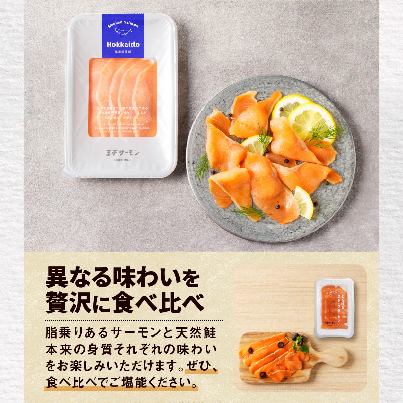 脂があるサーモントラウトを使用しスモークしたもの、あっさりとした身質の北海道産秋鮭を使用したスモークを是非食べ比べし、ご賞味ください。
