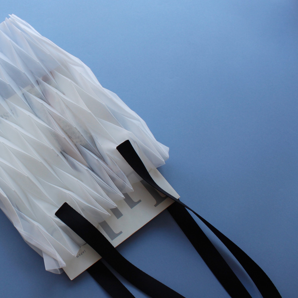 当返礼品は、自動車塗装用の手袋に使用される高密度ポリエステルメッシュを採用。厚さわずか90ミクロンという極薄素材を、専用ミシンと熟練の職人技で一枚ずつ丁寧に縫製しています。プリーツ加工を施し、超軽量ながら高い耐久性を実現。上品な透け感と独特の手触りをお楽しみいただけます。