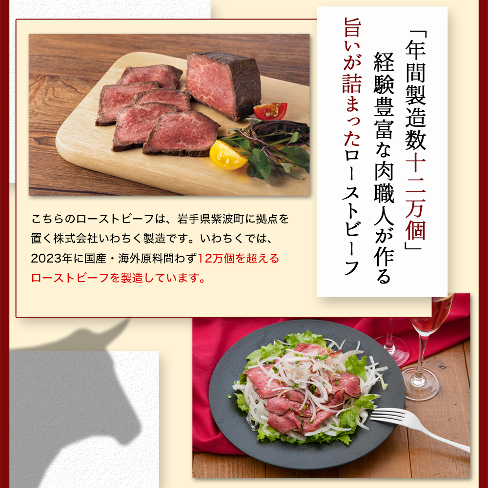 国産、海外原料を問わない、ローストビーフの2023年製造数12万個以上!熟練の技術の経験によりしっとり柔らかなローストビーフが完成! 黒毛和牛 とホルスタインの掛け合わせのみの東北産交雑牛、モモ肉のみを使用。黒毛 和牛 の脂がのった サシ と交雑牛の肉感でいいとこどり、まさに、 プレミアムローストビーフ です。
