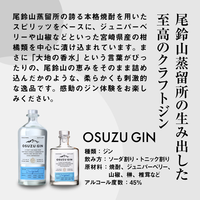 尾鈴山蒸留所の誇る本格焼酎を用いたスピリッツをベースに、ジュニパーベリーや山椒などといった宮崎県産の柑橘類を中心に漬け込まれています。