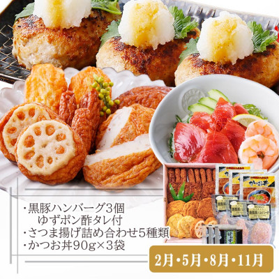 かつお丼・さつま揚げ・鰹のタタキ・ハンバーグ・黒豚餃子