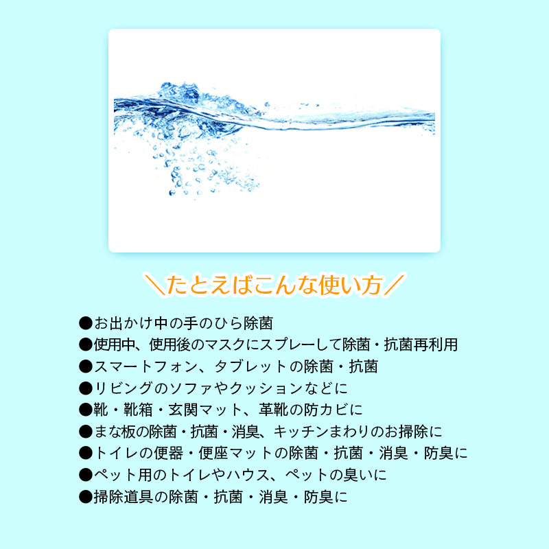 手の除菌やマスクの抗菌、ペットの消臭などの他、お風呂場や革靴の防カビ、加湿器の中の雑菌、ヌメリ予防など幅広くご使用いただけます。