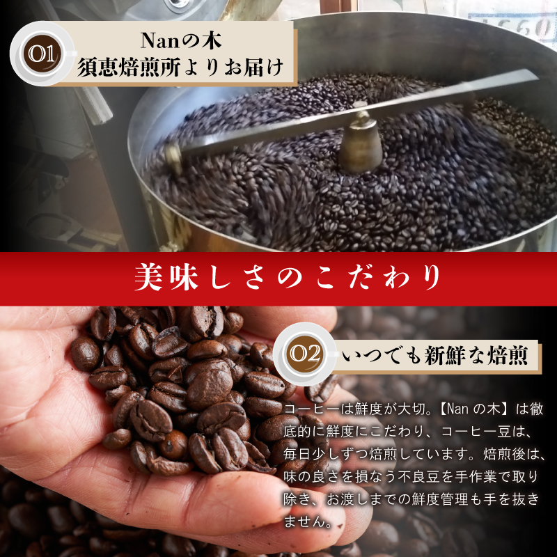 Nanの木では、世界60か国以上といわれるコーヒー産地の中から、常時30か国以上のコーヒー豆を取り揃えています。その中でも、店舗で人気の高いコーヒーや、店主おすすめの銘柄、Nanの木ならではのブレンドなどを厳選し、5種類を各4袋ずつ詰め合わせました。