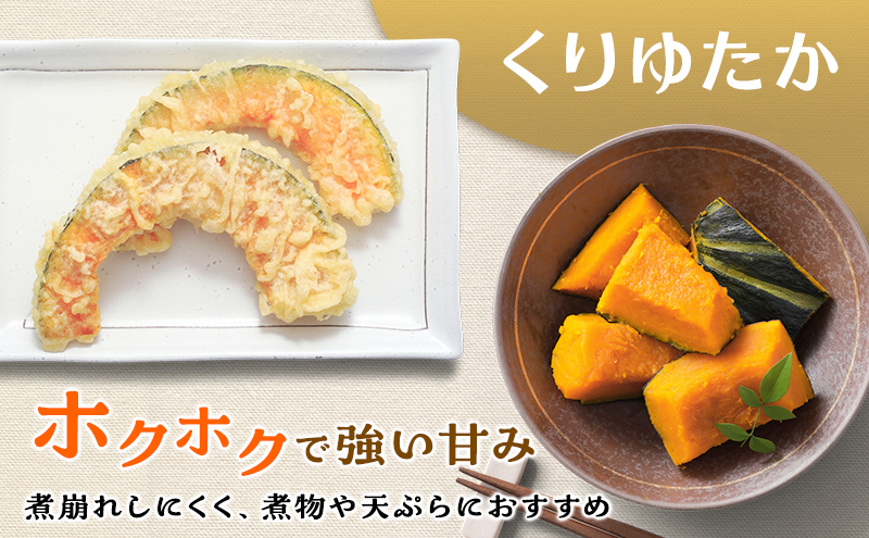 ホクホクとした強い甘みが特徴の栗かぼちゃです。濃厚な味わいで煮崩れしにくく、煮物や天ぷらに最適。冷凍のまま調理可能で、コロッケやサラダにしても素材の甘みが際立ちます。