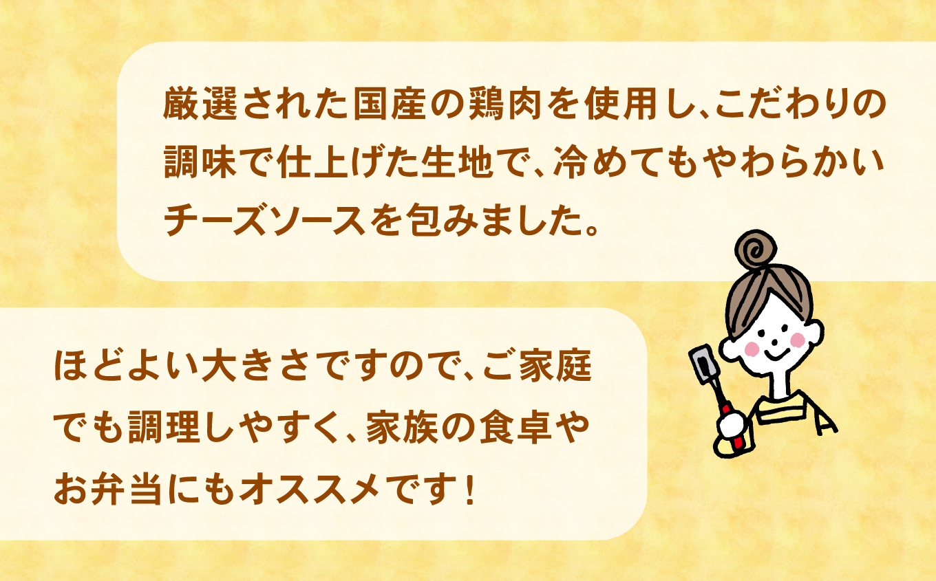 厳選された国産鶏肉を使用し、こだわりの調味で仕上げた生地で冷めてもやわらかいチーズソースを包みました。
