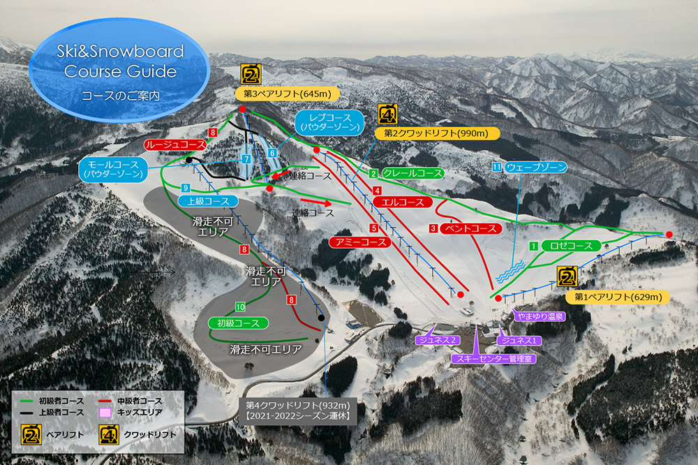 スキー場には源泉かけ流しの「やまゆり温泉」が併設されており、日帰り入浴・宿泊も可能です。