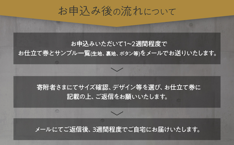 お申込みいただいて1~2週間程度でお仕立て券とサンプル一覧(生地、裏地、ボタン等)をメールでお送りいたします。