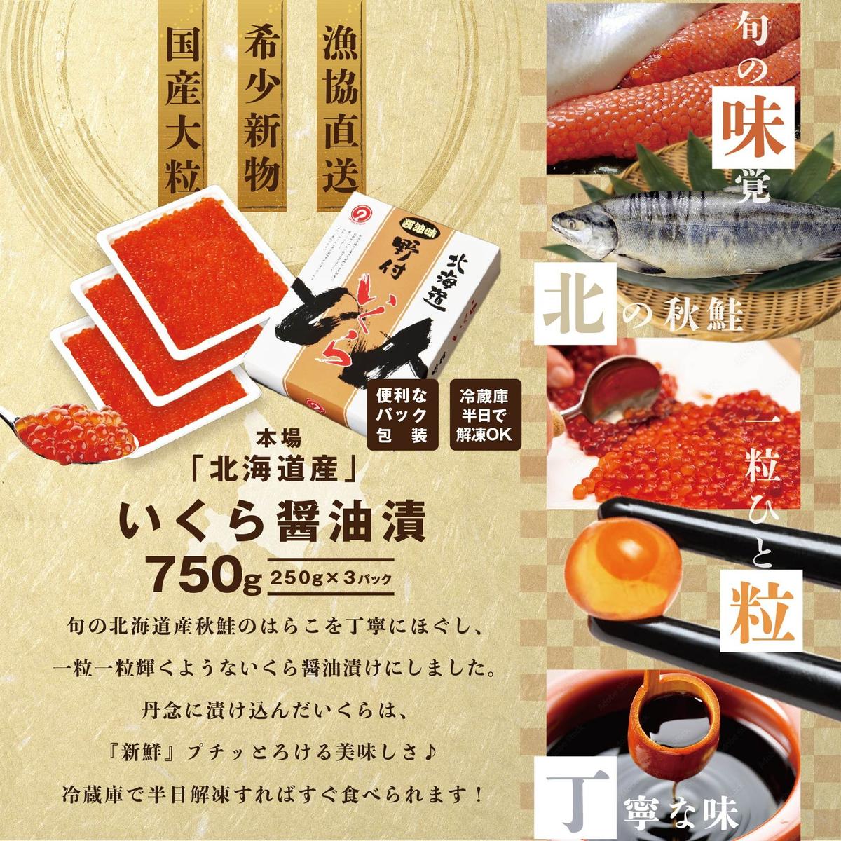 本場北海道のいくらを特製醤油だれに漬けた逸品です。お子様からご年配の方までどなたにも食べやすい味付けに仕上げました。750g(250g×3パック)お届けいたします。