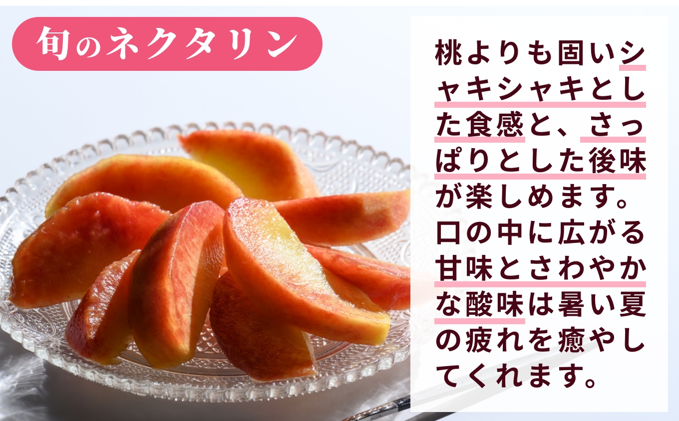 ネクタリンは、桃の仲間で皮の表面に毛がなく、つるつるとしていて皮ごと食べられ、桃よりも固いシャキシャキとした食感と、さっぱりとした後味が楽しめます。口の中に広がる甘味とさわやかな酸味は暑い夏の疲れを癒やしてくれます。