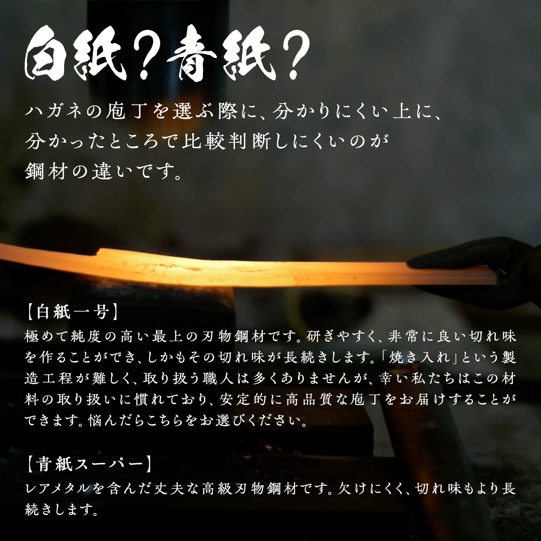 極めて純度の高い最上の刃物鋼材です。研ぎやすく、非常に良い切れ味を作ることができ、しかもその切れ味が長続きします。「焼き入れ」という製造工程が難しく、取り扱う職人は多くありませんが、幸い私たちはこの材料の取り扱いに慣れており、安定的に高品質な庖丁をお届けすることができます。