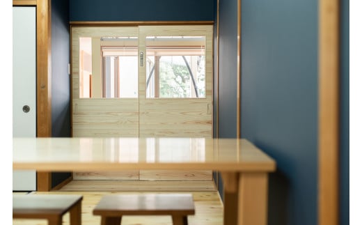 大自然に馴染むように佇むレトロな建物内には、木の温もりと洗練されたデザインで統一された空間が広がります。