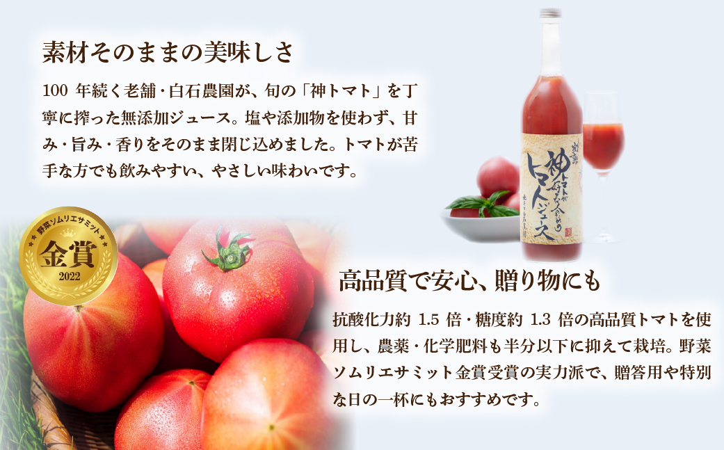 100年続く老舗農家・白石農園が、もっとも美味しい時期の「神トマト」を丁寧に搾り、無添加で仕上げた特別なトマトジュースです。
