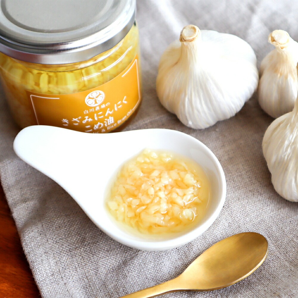 【きざみにんにくこめ油】 常備必須の万能調味料。香り豊かな新鮮にんにくを1瓶に約3個分使用。スプーンですくってすぐに使える台所の強い味方。和洋中にかけるだけ、まぜるだけで圧倒的な?にんにく感?をプラス。ガーリックライスやトーストも簡単にできます。