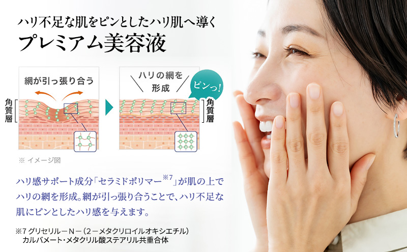 有効成分「ライスパワーNo.11α」をはじめ、「ハリ・弾力※1不足」「くすみ※2」など見た目年齢にアプローチする美容成分を贅沢配合。肌自らのうるおいをさらに高め、弾むようなハリ・弾力、透明感を与えて若々しい印象に導きます。 顔全体だけでなく、目元や口元など年齢の出やすい部分の集中ケアにも。
