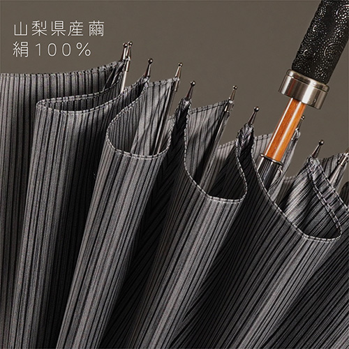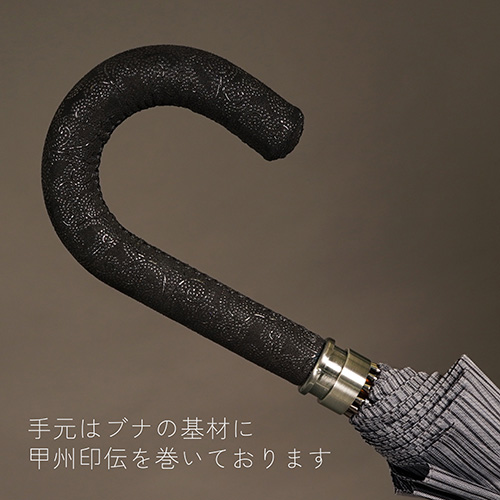 江戸時代、粋を極めた甲斐絹を「(株)甲斐絹座」が山梨県産の繭を使い、現代の技術で復刻いたしました。その中でも男の粋を感じる絣織で傘にしました。手元は甲州印伝とコラボし手になじむ品とし、骨は樫の木棒の16ケンで(株)槙田商店の伝統の技術で仕上げました。